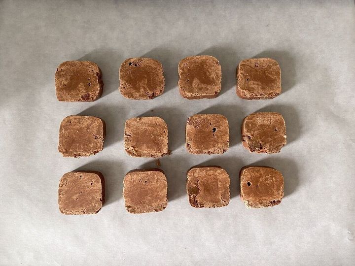 (6)5〜10分程冷蔵庫に置いたら取り出し、5〜6mm厚に切ってオーブンシートを敷いた天板の上に並べる。