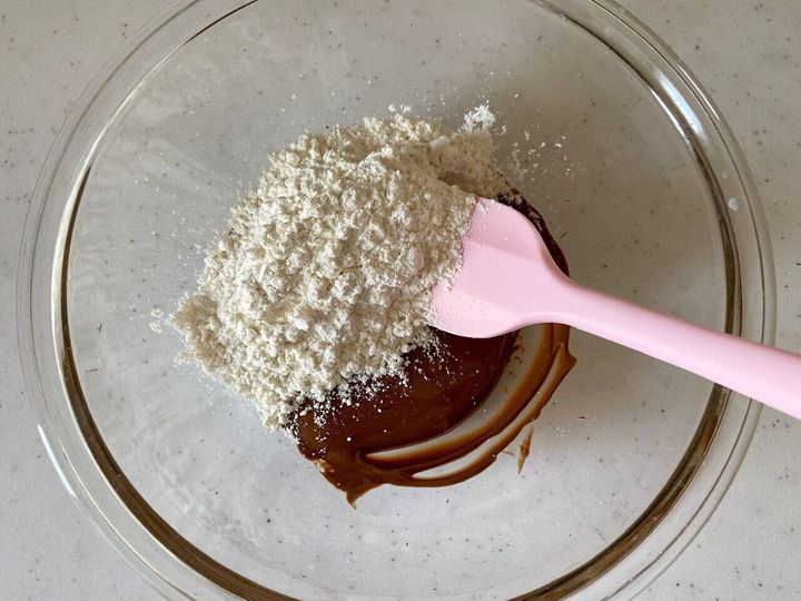 (3)チョコレートをレンジにかけている間に薄力粉をふるっておき、クリーム状になったチョコレートに加え、粉っぽい部分がなくなるまで混ぜる。