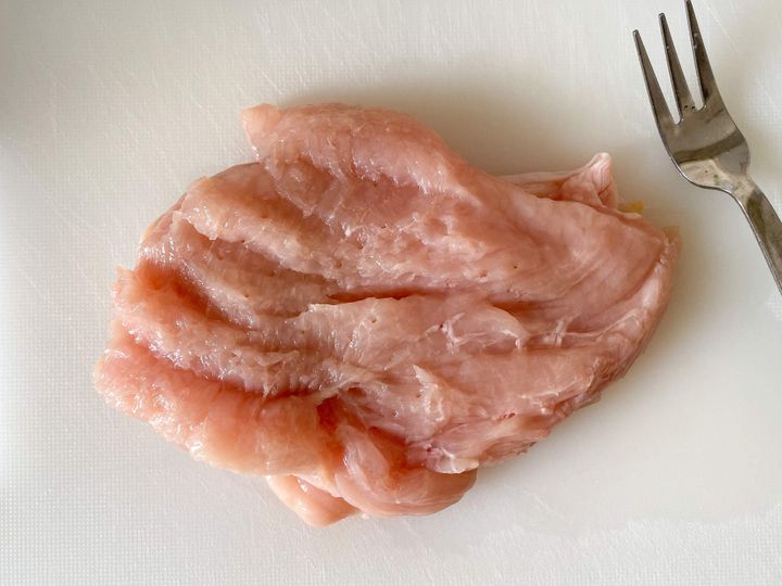 (1) 鶏むね肉は包丁で出来るだけ均一な厚みになるよう開いた後、両面ともフォークで全面さす。