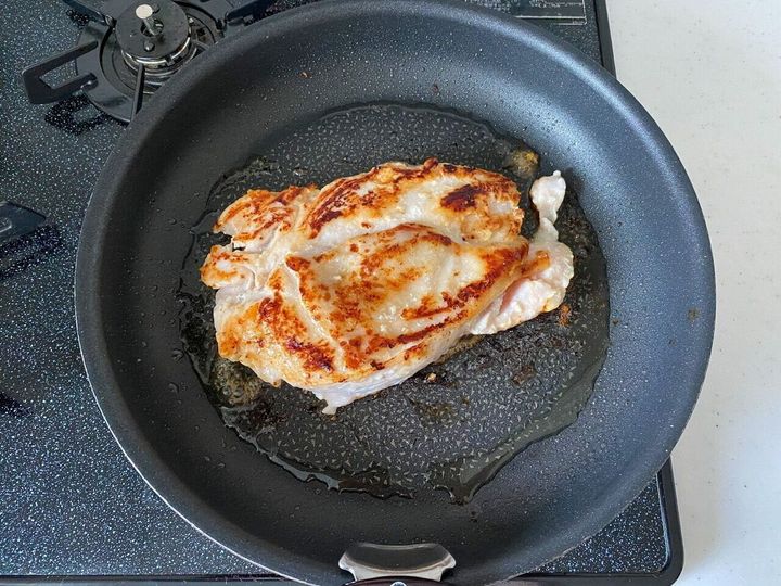 ひっくり返してこれくらいの色になっていればOK!焼き色がなかなかつかない場合は、火が弱いか、鶏肉の中央辺りが反り返っていることがありますので、ヘラを使ってフライパンに鶏肉を押し付けて、もう少し焼いてみてください。