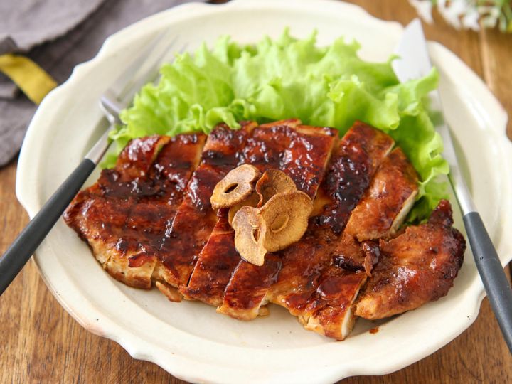 また、ガーリックチップを添える際は、鶏肉を焼く前にサラダ油で薄切りにんにくを焼き上げします。その油で鶏肉を焼くことで、一段と香り高く仕上がります。