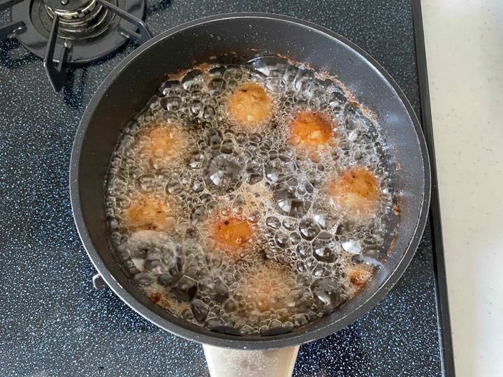 (3) 鍋にサラダ油を170度になるまで熱し、(2)を数個ずつ入れて4分程かけてこんがりするまで揚げ、油を切っておく。
