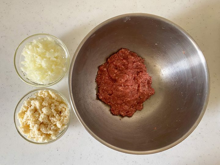 (1) 玉ねぎはみじん切りにし、おからパウダーは水を加えて戻しておく。合いびき肉はボウルに入れ、塩・胡椒を各少々加え、粘りが出るまでよく混ぜる。