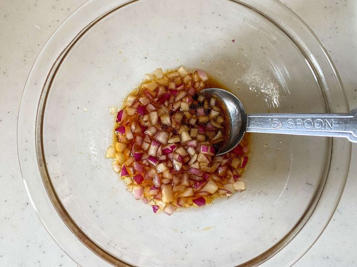(2) ボウルにぽん酢、砂糖、ごま油を混ぜ合わせ、みじん切りにした紫玉ねぎを加えて混ぜる。