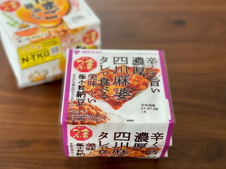 この卵醤油たれが絶妙な美味しさで、冷蔵庫にストックがなくなれば必ずお買い上げするほど大好きな納豆です。その同じ金のつぶシリーズから今年発売された「辛くて旨い濃厚四川麻婆タレで食べる美味~い極小粒納豆」。3月から販売開始しているそうですが、近所の大型スーパーで最初に見かけたのは6月。スーパーで軽く衝撃を受けて即買いしました!