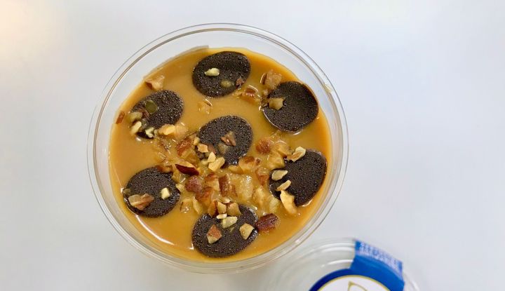 いちばん上のキャラメルムースには、ナッツとビターチョコレートがのっています。味と食感にアクセントを出してくれています。焦がしキャラメルソースはビターな味わいで、キャラメルムースとよく合います。