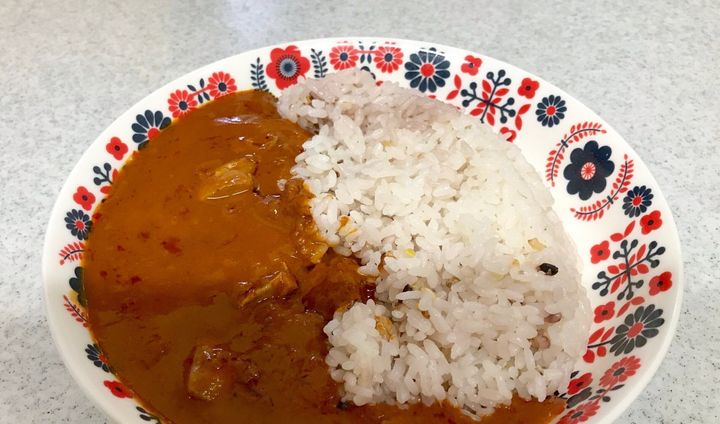 お鍋で湯せんをしてから、白米の横にかけました。封を開けた瞬間、マイルドだけどスパイシーな香りが漂います。具材は、鶏肉がゴロゴロと入っていました。
