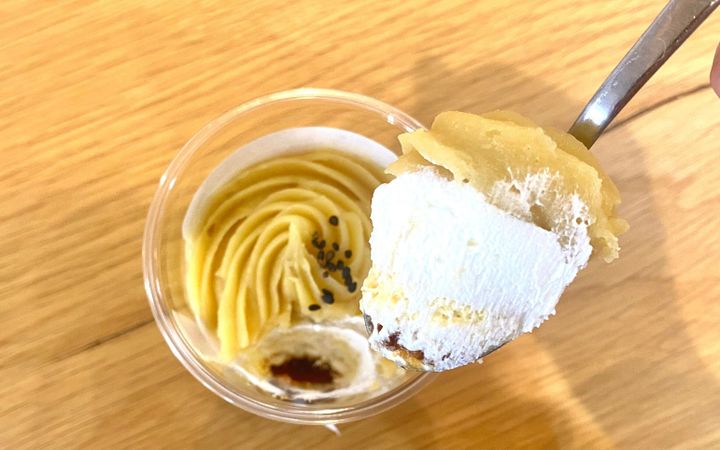 その下にはホイップクリーム、スポンジ、カラメルゼリーが層になっていて