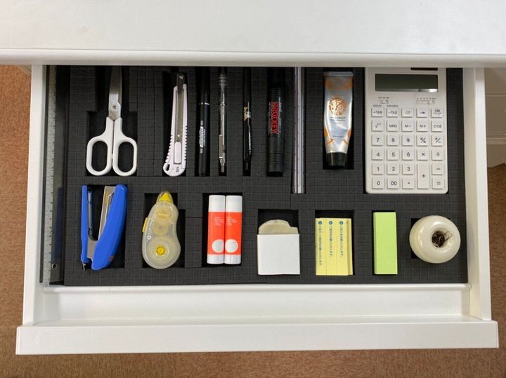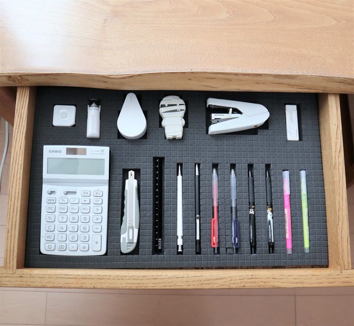 在宅ワークのデスクや子供デスクなど、机1つで全て完結されたい方、数があまりない方にはこちらの収納がおすすめです!お気に入りの文具を必要なサイズにくり抜くだけで、唯一無二の文具収納の完成です。出来上がりをイメージして配置を決めてから、くり抜きましょう。