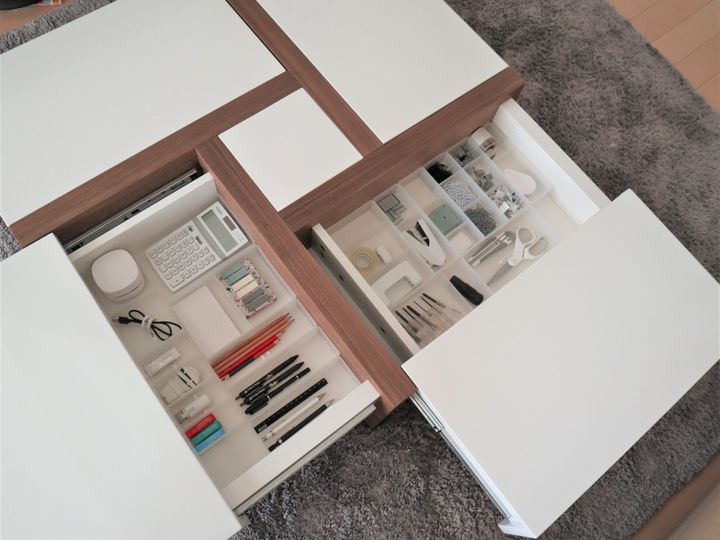 引き出し収納がない!という方には、レターケースやスタッキングできる引出し式収納がオススメです。最近ではテーブルに両面テープで引出しを作れる商品も登場していますので、自分好みのタイプを見つけてみてください。