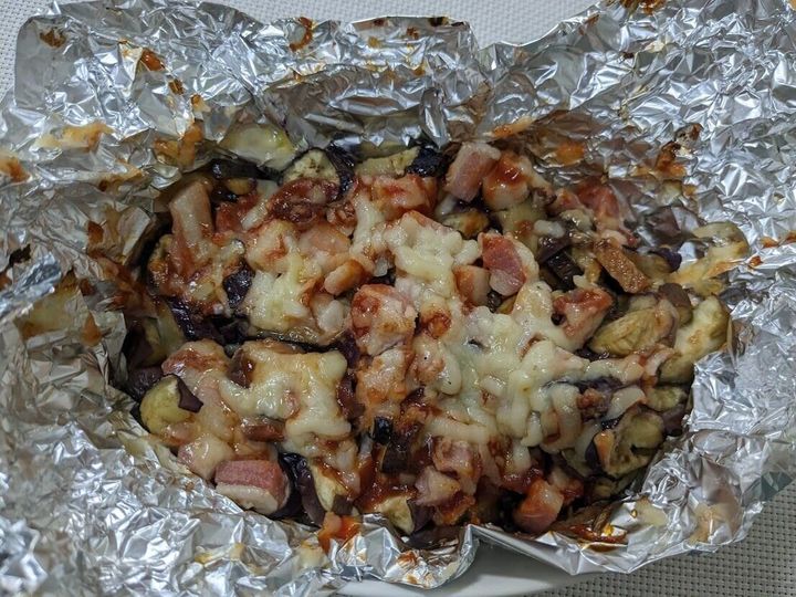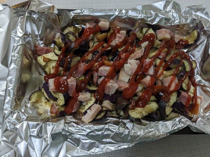 ③グリルパンにアルミホイルを敷いて、ナス、ベーコン、ケチャップ、チーズの順番に載せていく