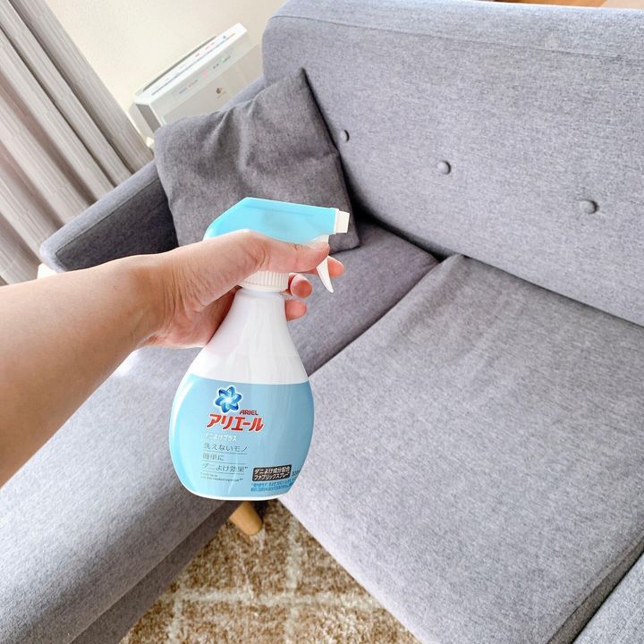 1.ソファーやベッド、カーペットなどの中で、取り外して洗える物は画像左の洗剤を使用して洗濯→干す。
