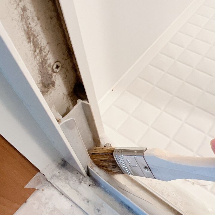 カビが気になるところには、カビ用洗剤を使い、同じように刷毛で塗ったあと、数分放置して洗い流します。