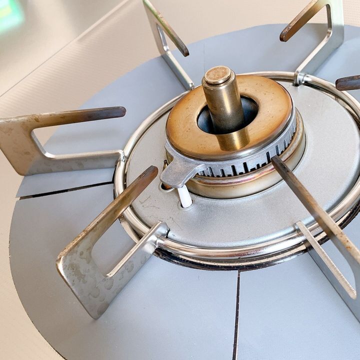 掃除前のガスコンロは変色が進んで茶色くなっています。