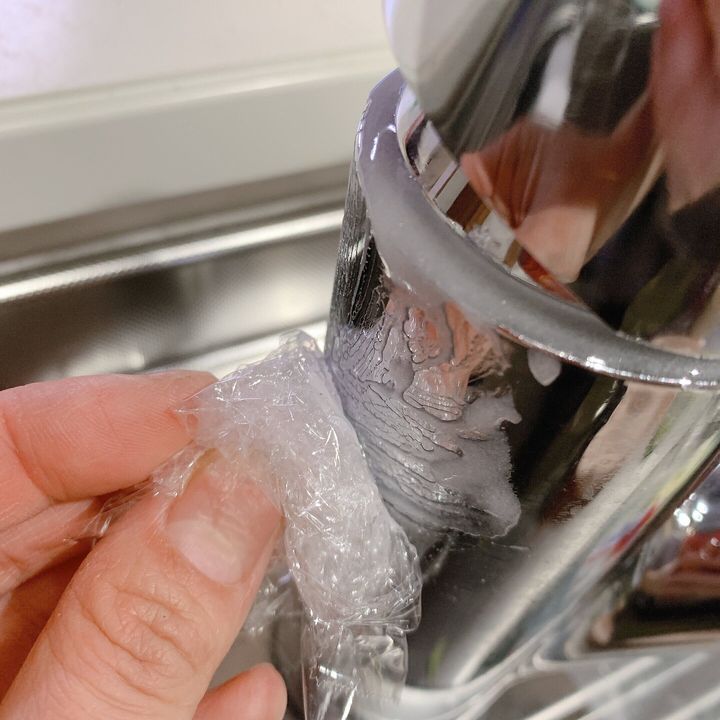 数分後、多く出過ぎたジェルが流れてきたので、それを利用してラップを丸めたもので蛇口全体に広げていきます。