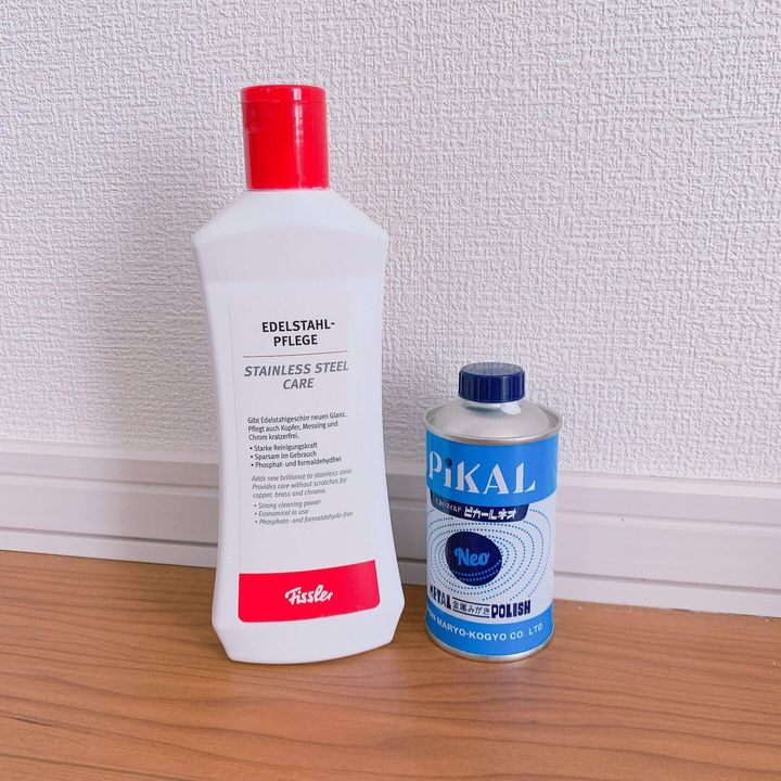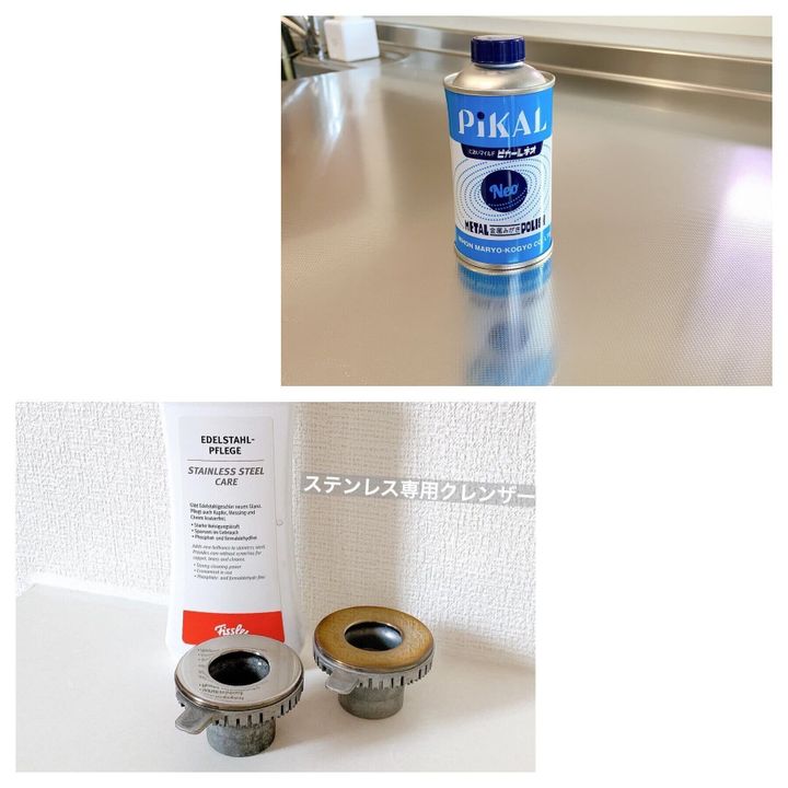 右のピカールは、研磨剤ですが見た目はクリーム状になっていて、柔らかい布でひたすら拭いていきます。最後は食器用洗剤やウタマロでよく洗い流すことで、より綺麗になります。