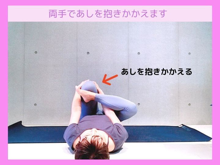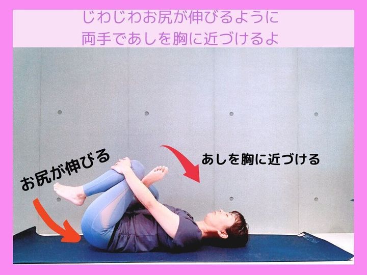 両手で両脚を胸に近づけるときは、痛くなるほど行わないようにして、気持ちよくお尻が伸びてるな〜という程度に引き寄せましょう。