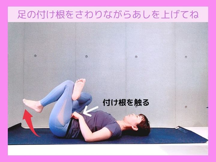 脚の付け根をさりながら両脚をマットから持ち上げます。