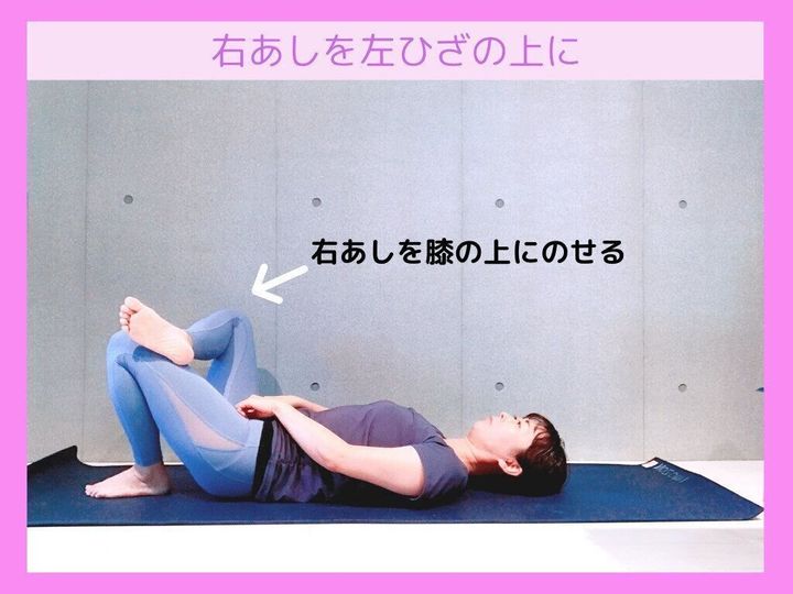 脚の付け根をさわりながら、右脚の足首を、左のヒザ上に乗せます。