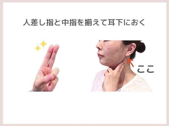 人差し指と中指を揃えて耳の下に優しめに置きます。