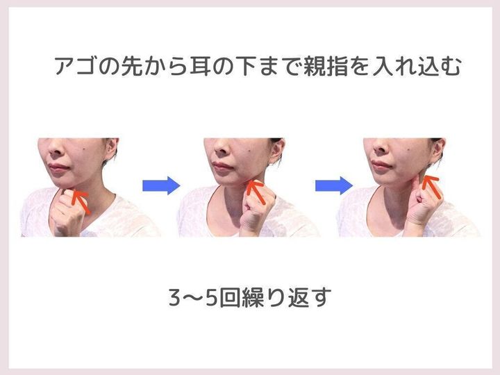 親指を骨のキワに入れ込みながら、アゴの先から、耳の下まで親指を移動させます。この流れを3〜5回行います。