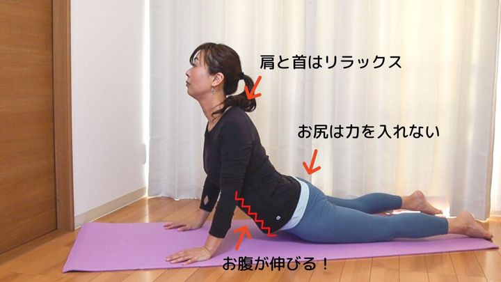 今回はヨガのポーズ「上向きの犬のポーズ」で、硬くなりやすいお腹の腹直筋を気持ちよく伸ばしていきます。