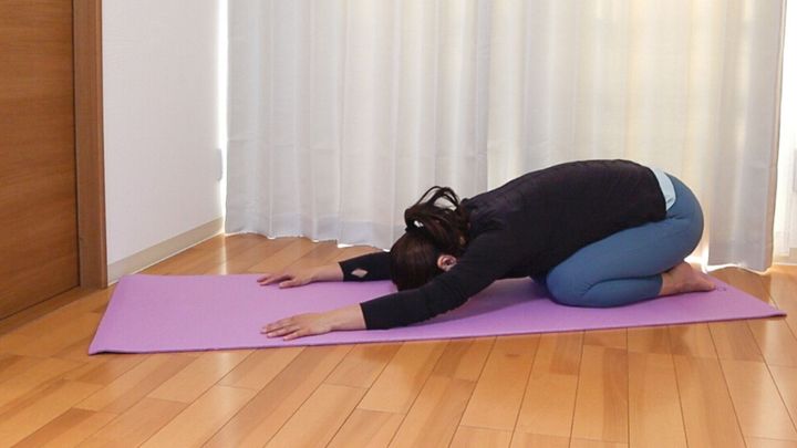 お尻をかかとに下ろし両手を楽に前に伸ばします。おでこを床におろしてリラックス。