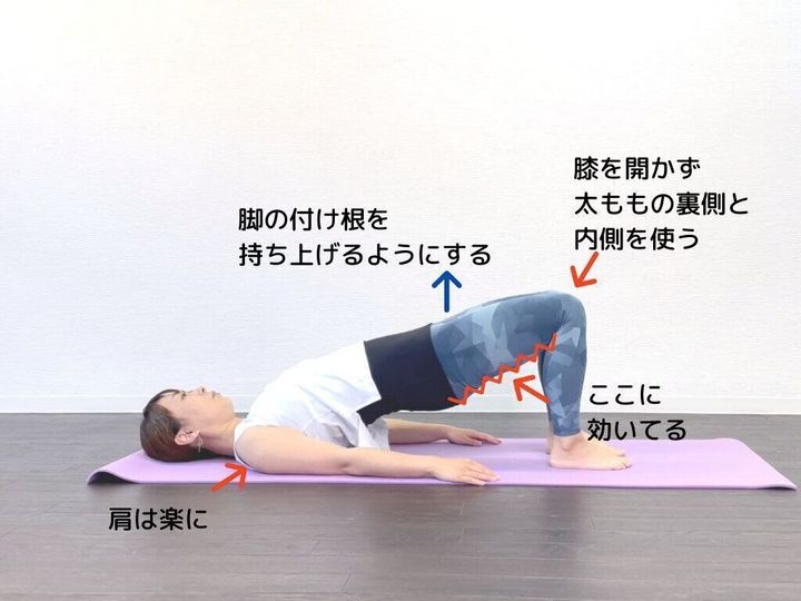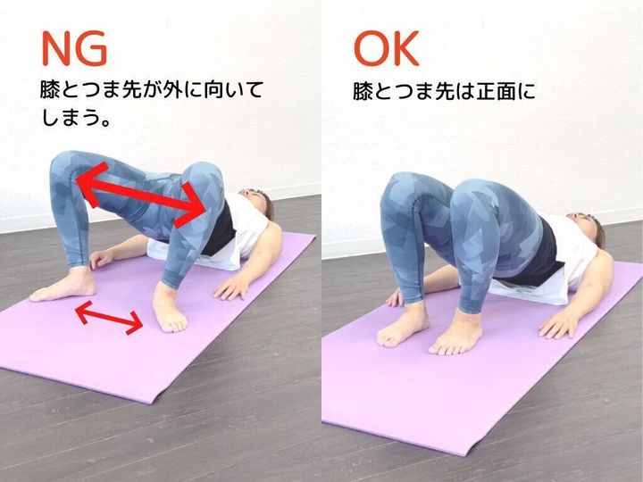 膝とつま先が外に開いてしまうと、太ももの内側と裏側がうまく使えず、お尻と脚の引き締め効果がなくなってしまいます。