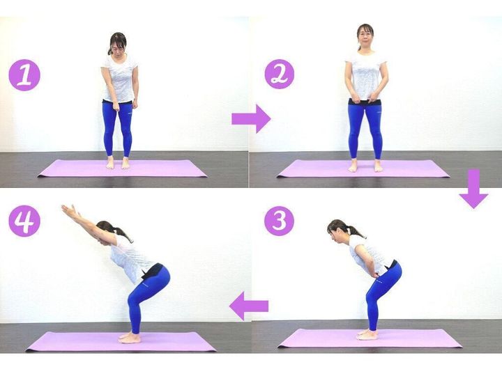 (3) 膝を曲げながらお尻を後ろに突き出すようにし、上半身を足の付け根から倒しましょう。