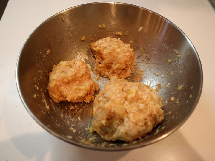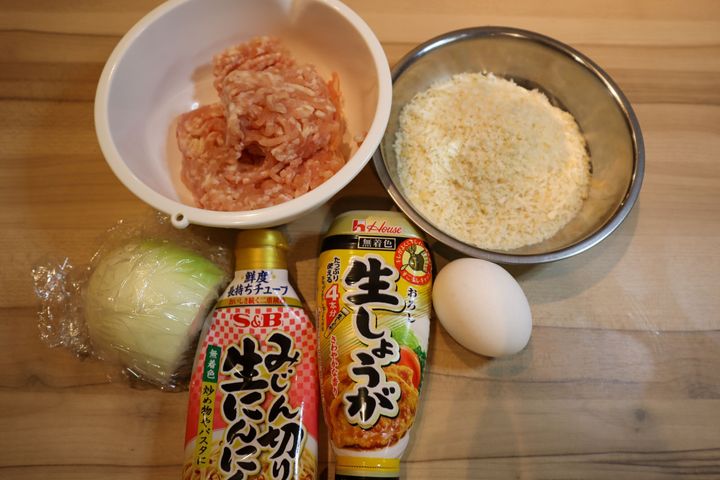 ・ボウルに鶏ひき肉、パン粉、卵、炒めた玉ねぎ、塩胡椒、おろしニンニク、おろし生姜を入れ、粘りが出るまで手でこねます。