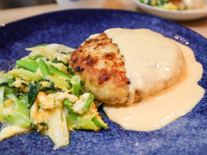 鶏ひき肉を使うのであっさりしていますが、ソースにチーズを使います。濃厚感ある豆乳チーズソースで満足度も高いハンバーグです。