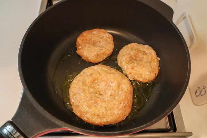 ・フライパンに油をひき、形成したハンバーグを入れて弱火で焼きます。