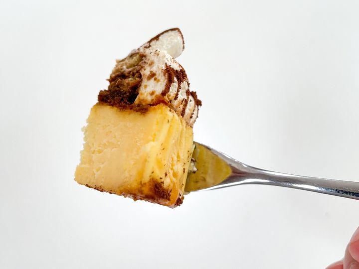 バスク風チーズケーキとティラミスが入るようにフォークで一口サイズにカットし、口の中へ入れてみました。