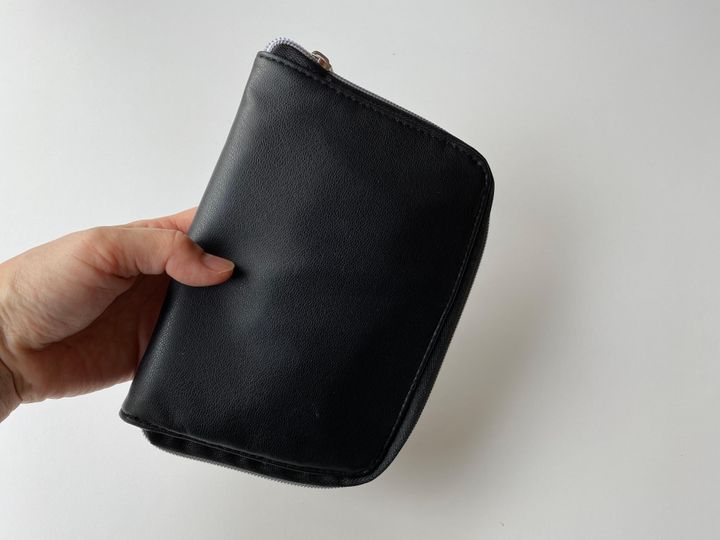そこで、保管にはファスナー付きのフェイクレザーの文庫本カバーを利用することにしました。イオンの文房具屋さんで100円に値下げされていたものを愛用しています。