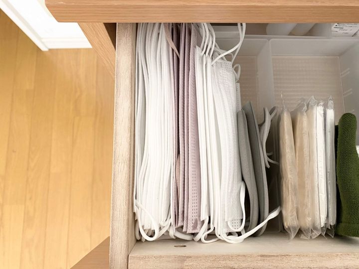 サンキュ!STYLEライターで整理収納アドバイザーのnocoです。不織布マスクを愛用していますが、進化がすごいですよね。最近購入したマスクは、ミッフィー柄(ワンポイント)のマスクや立体マスク、血色マスクなどです。可愛くて使うのをためらってしまう事もありますが、マスクのお洒落も楽しめるようになり嬉しいです。このところ、「マスクの収納ってどうしていますか?」と聞かれる機会も増えてきました。今回は我が家のマスク収納についてご紹介したいと思います。