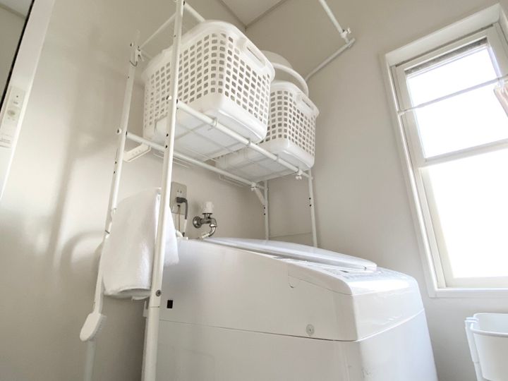 極小の洗面所の我が家で床面積を残し、必要なモノを置くために、ニトリの洗濯機ラックを使っています。縦空間を上手に利用することで、脱衣所のスペースを有効活用できています。