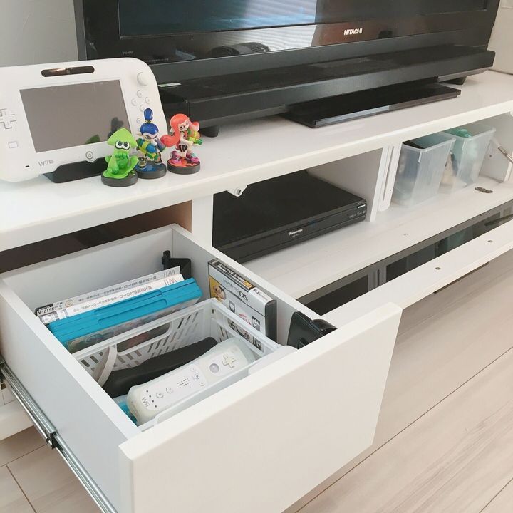 テレビボードにはゲームやブルーレイ、ビデオカメラなどを収納しています。