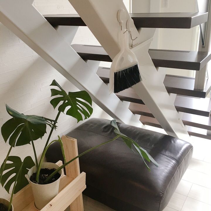 リビングの階段のところにマグネットフックをつけ、ミニほうきセットを吊るしています。