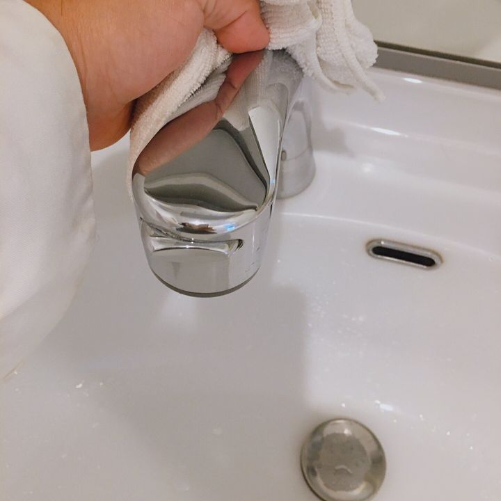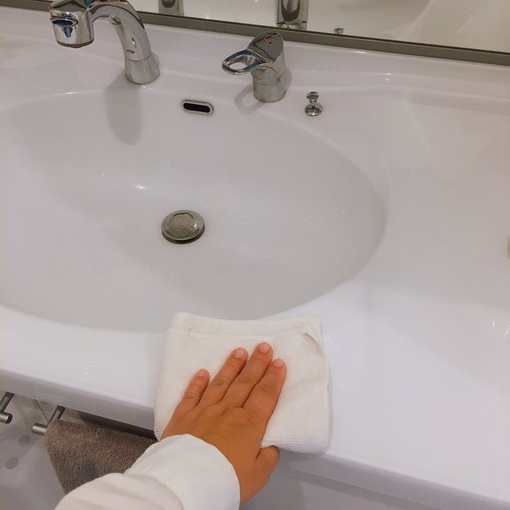 洗面台の周りについた水滴を、マイクロファイバークロスで拭き取ります。