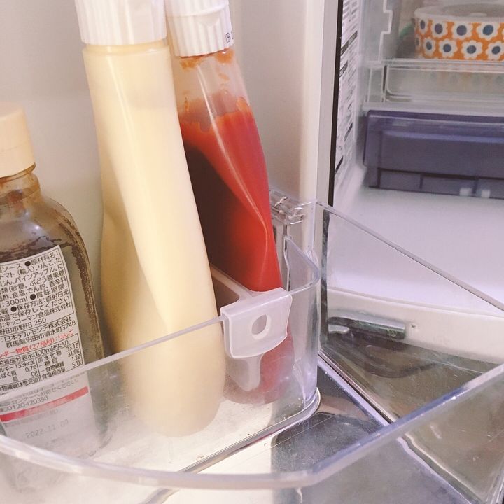 我が家ではドアポケットにマヨネーズとケチャップとソースを収納しています。DAISOで購入した仕切りをドアポケットに挟むだけ。マヨネーズやケチャップが倒れることがなくなり、子供でも出し入れが簡単になりました。