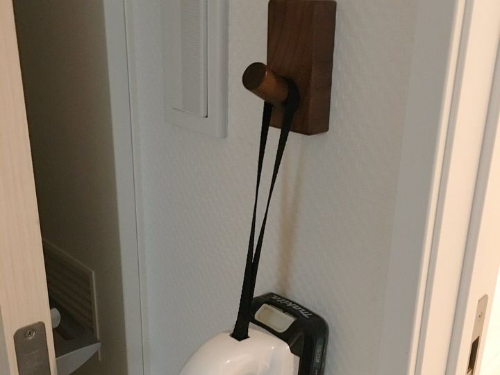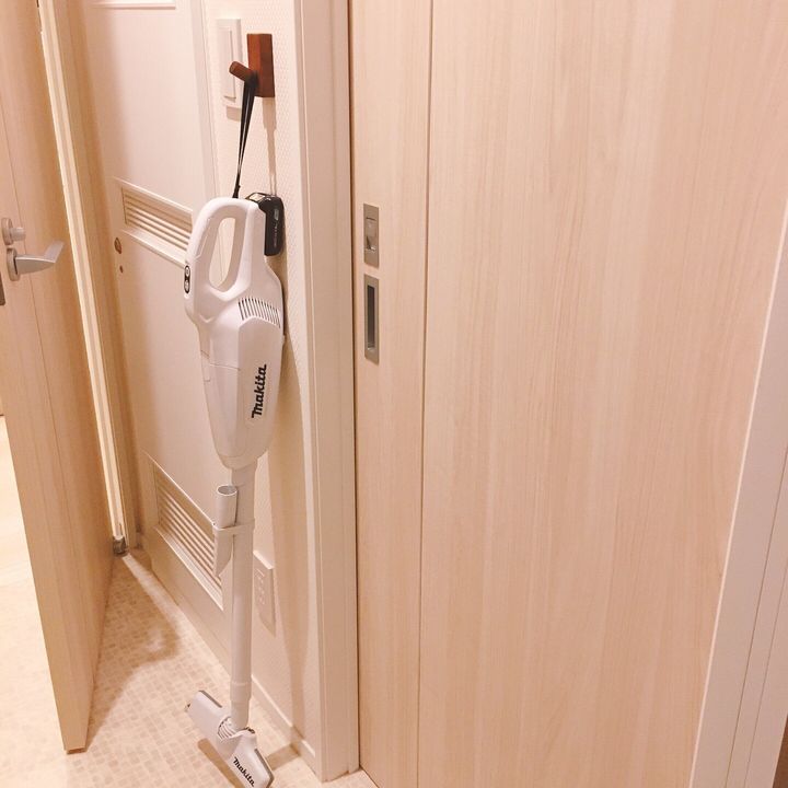 掃除機は納戸の中に入れず、我が家では掃除機はキッチン横の脱衣スペースに吊るして収納しています。汚れが気になったらサッと取り出してそのまま掃除に取り掛かれます。