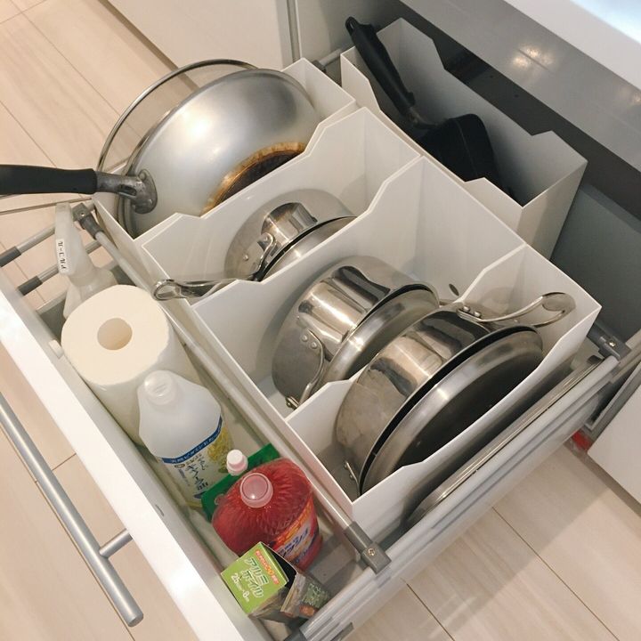 鍋やフライパンはよく使うモノをワークトップ下の引き出しに、ファイルボックスに立てて収納しています。見やすく、取り出しやすいので使いたいモノをさっと取り出すことができます。しまう時もさっとしまえます。立てる収納は引き出しタイプのキッチンに向いている収納方法の一つ。ファイルボックスも汚れたらじゃぶじゃぶ洗えるので便利です。