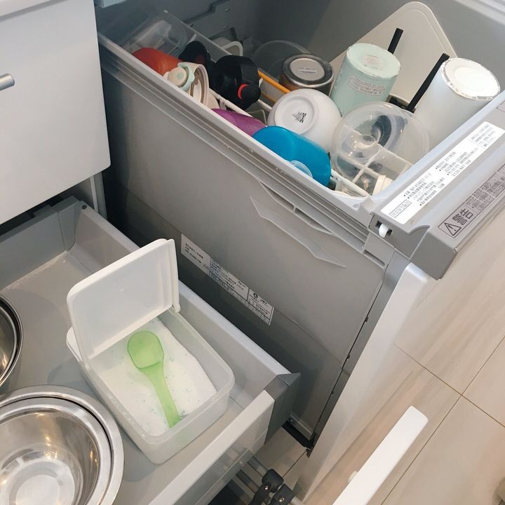 我が家では最初は食洗機の下の引き出しに洗剤を入れていました。しゃがんで→洗剤の箱を出し引き出しを閉め→立ち上がり→食洗機を開け→洗剤を入れ→食洗機を閉め→しゃがんで→洗剤の箱をしまい引きだしを閉め→立ち上がる