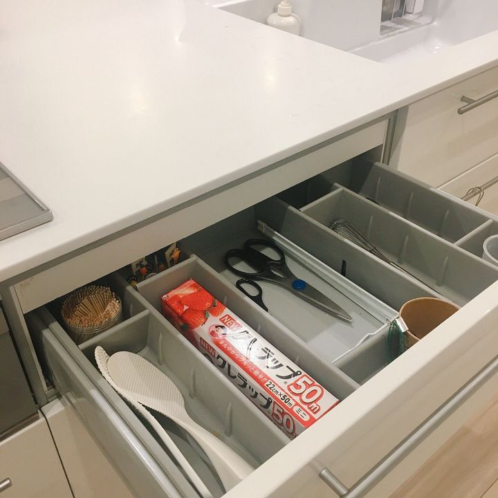 ラップは一番取り出しやすい引き出しに、アルミホイルは下の引き出しに入れています。同じような形だからという理由で、同じ場所に収納せず、使用頻度が高いモノを使いやすい場所に、使用頻度の低いモノはそれ以外の場所に収納します。収納スペースは使用頻度に応じて決めることをおすすめします。
