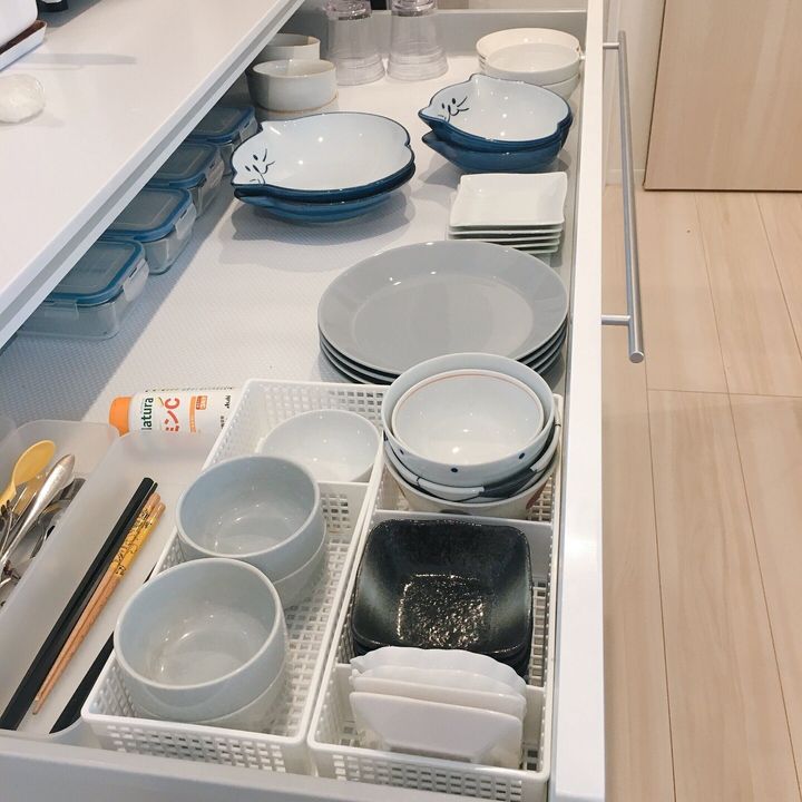 カップボードの一番上の引き出しが我が家の1軍食器たちの定位置。お茶碗やお椀、小皿など、よく使うモノがここに集約されています。食洗機から食器を戻す時にこちらの引き出しを開けたまま食器類をほぼ全部戻すことができます。