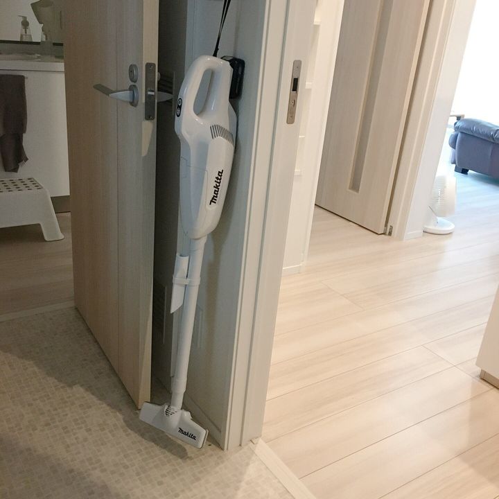 掃除道具が押入れの奥や納戸の中など取り出しにくい場所にあると、それだけでお掃除が面倒になってしまいます。一方、お掃除道具を見える場所に吊るしておくと汚れやホコリに気付いた時にサッとお掃除ができるのでとっても便利です。我が家ではキッチン横の脱衣所にコードレスクリーナーを置いているのですぐに気軽に使えます。