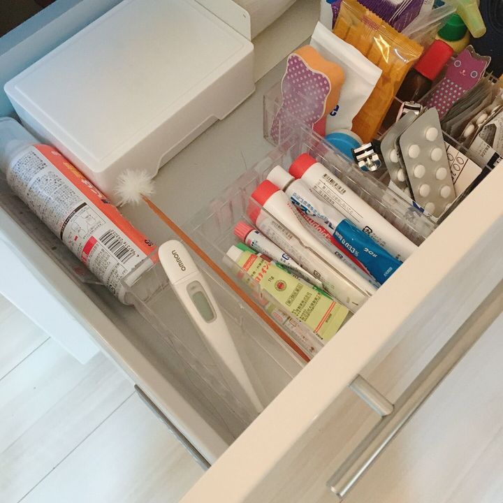 リビング収納に置いてあるものの多くは家族が共有して使うもの。体温計、耳かきや爪切り、名前ペンやハサミなどの文房具、薬やスキンケア用品など。大きさもあまり大きくないので、なんとなくリビングのテーブルの上やキッチンのカウンターのすみっこに置きっぱなしになっているなんてことはありませんか?家族が使いたい時に使えるようにするためには、どこに何があるかが明確でなければいけません。