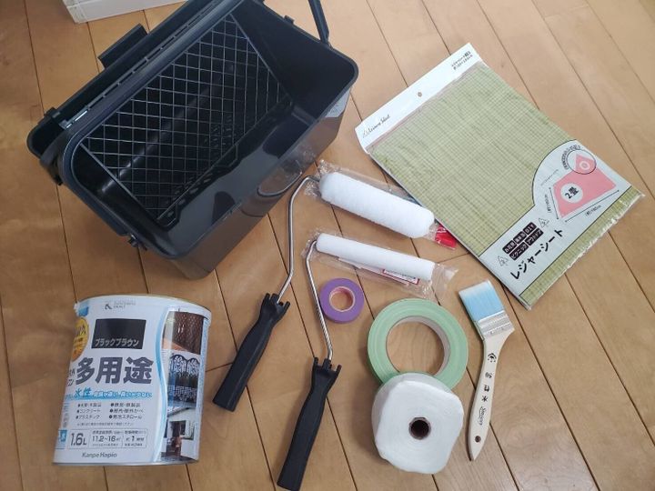 左から)ペンキ(水性)、バケット、バケット用ネット、ローラー、マステ、マスカー、養生テープ、ハケ、レジャーシート です