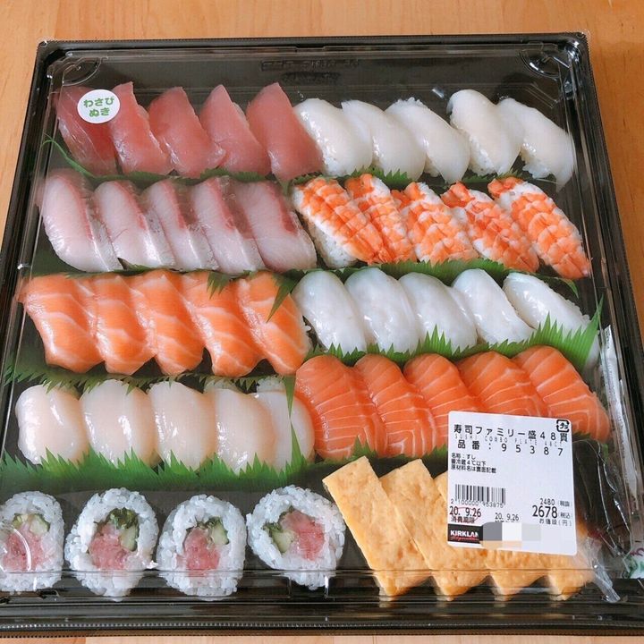 テレビやSNSなどでも多く取り上げられているコストコの【寿司ファミリー盛48貫】とにかく寿司ネタも大きくて普通の回転寿司の約1.5倍はあります!