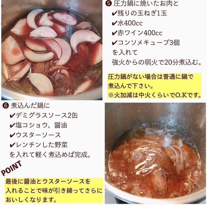 (5)圧力鍋に焼いたお肉と